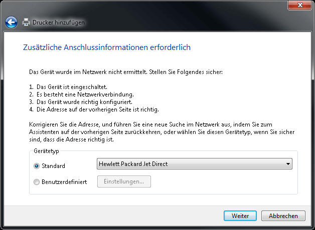 Nach einer Weile meldet sich Windows mit Zusätzliche Anschlussinformationen erforderlich. Wählen Sie dann im Gerätetyp neben Standard den Eintrag Hewlett Packard Jet Direct und klicken Sie auf Weiter.