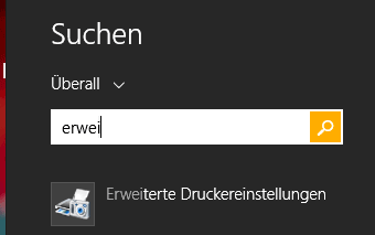 Tippen Sie dann Erweiterte Druckereinstellungen ein. Schon nach den ersten drei, vier Buchstaben, sollte die entsprechende Funktion erscheinen.