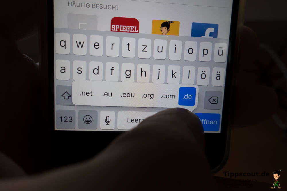 Beim Eintippen von Domain-Namen im Safari Browser können Sie sich das Eintippen der Domain (also .de oder .org) sparen. Halten Sie dazu die Punkt-Taste länger gedrückt. Dann öffnet sich eine kleine Liste mit Domains, aus der Sie wählen dürfen.
