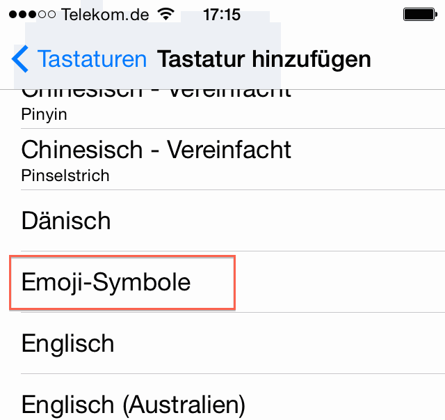 5. Scrollen Sie in der Liste nach unten, bis Sie den Eintrag Emoji-Symbole sehen. Tippen Sie einmal darauf, um diese Tastatur zu der Liste der installierten Tastaturen hinzuzufügen.