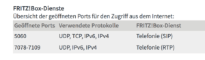 Zusätzlich sollten Sie unter Diagnose – Sicherheit nachsehen, welche Dienste die Fritzbox für den Zugriff von außen frei geschaltet hat. In unserem Beispiel sind das die Ports, die für die Internet-Telefonie benötigt werden.