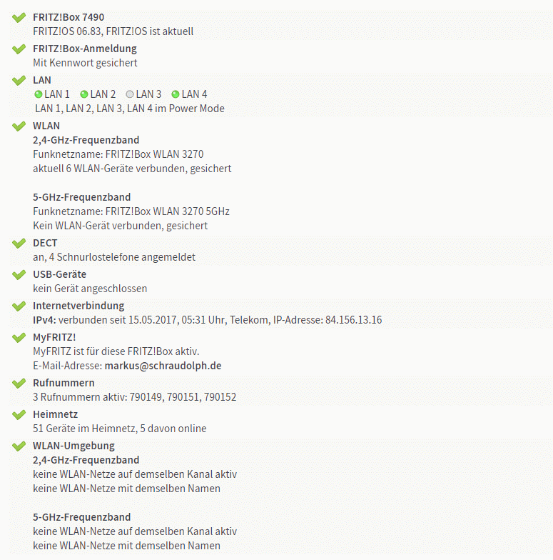 Neben der reinen Fehlerdiagnose können Sie dieser Liste auch für andere Zwecke einsetzen. So sehen Sie zum Beispiel die Anzahl der angeschlossenen WLAN-Geräte inklusive der verwendeten Frequenz, Ihre DLS-Geschwindigkeit im Down- und Upstream und die Nutzung der eingebauten Ethernet-Anschlüsse.