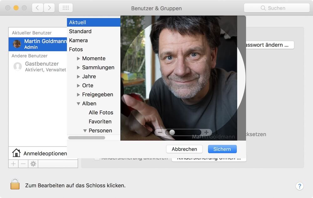 Sobald Sie den passenden Ausschnitt gewählt haben, klicken Sie auf Sichern und Ihr Benutzerkonto auf dem Mac hat ein neues Profilbild.