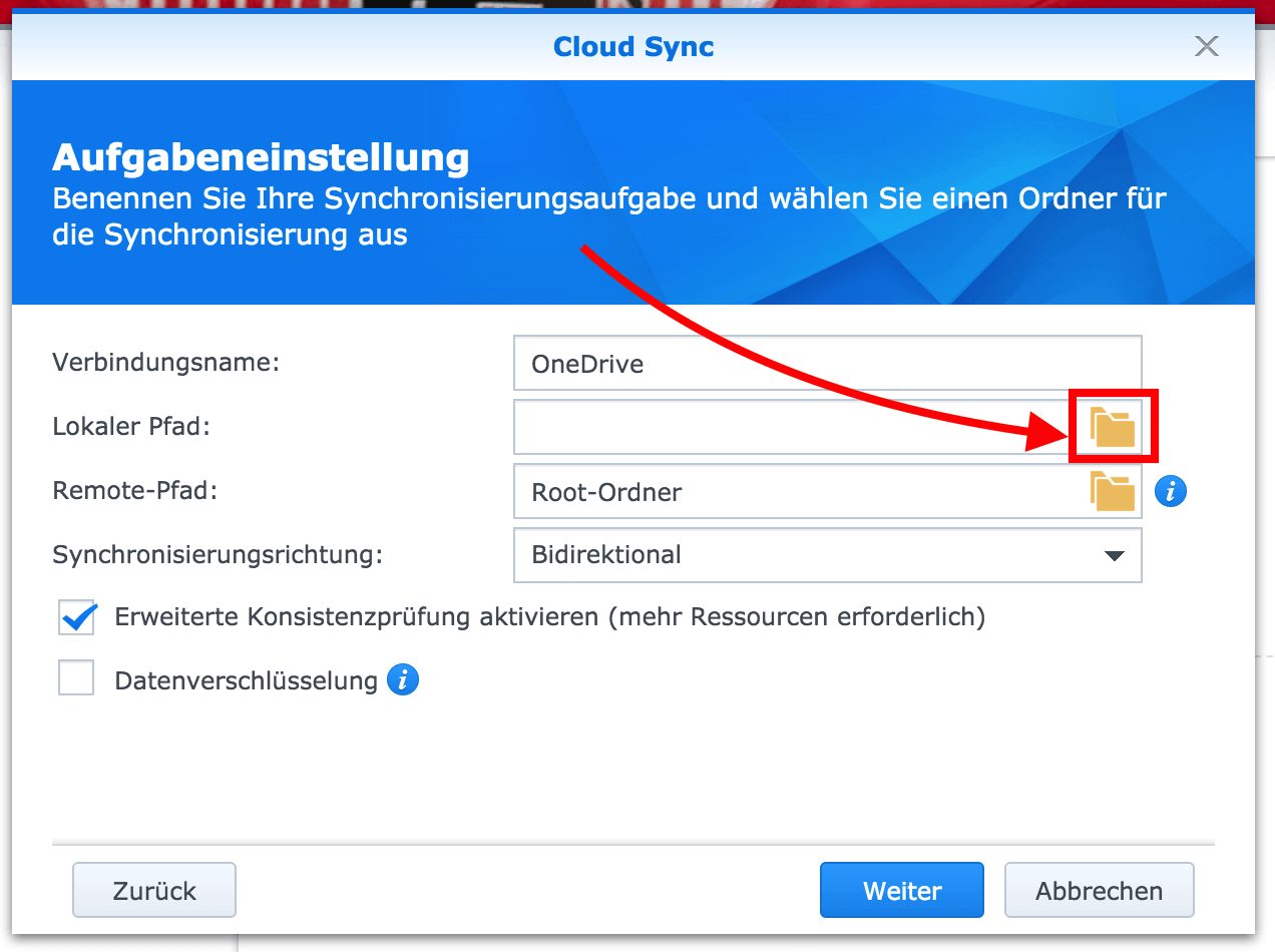 Anwendungsbeispiel: Einen Bilderordner auf der Diskstation als Backup in Onedrive synchronisieren (Verschlüsselung optional).