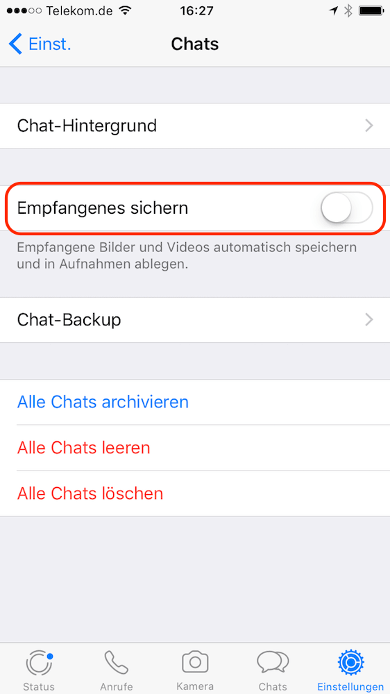 Nun deaktivieren Sie die Einstellung Empfangenes sichern.