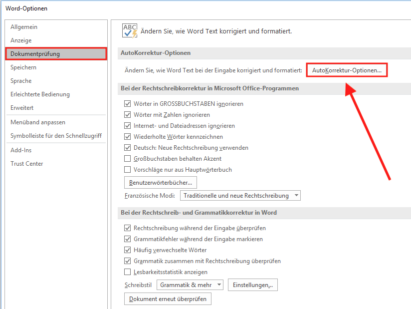 Wählen Sie rechts den Knopf AutoKorrektur-Optionen.